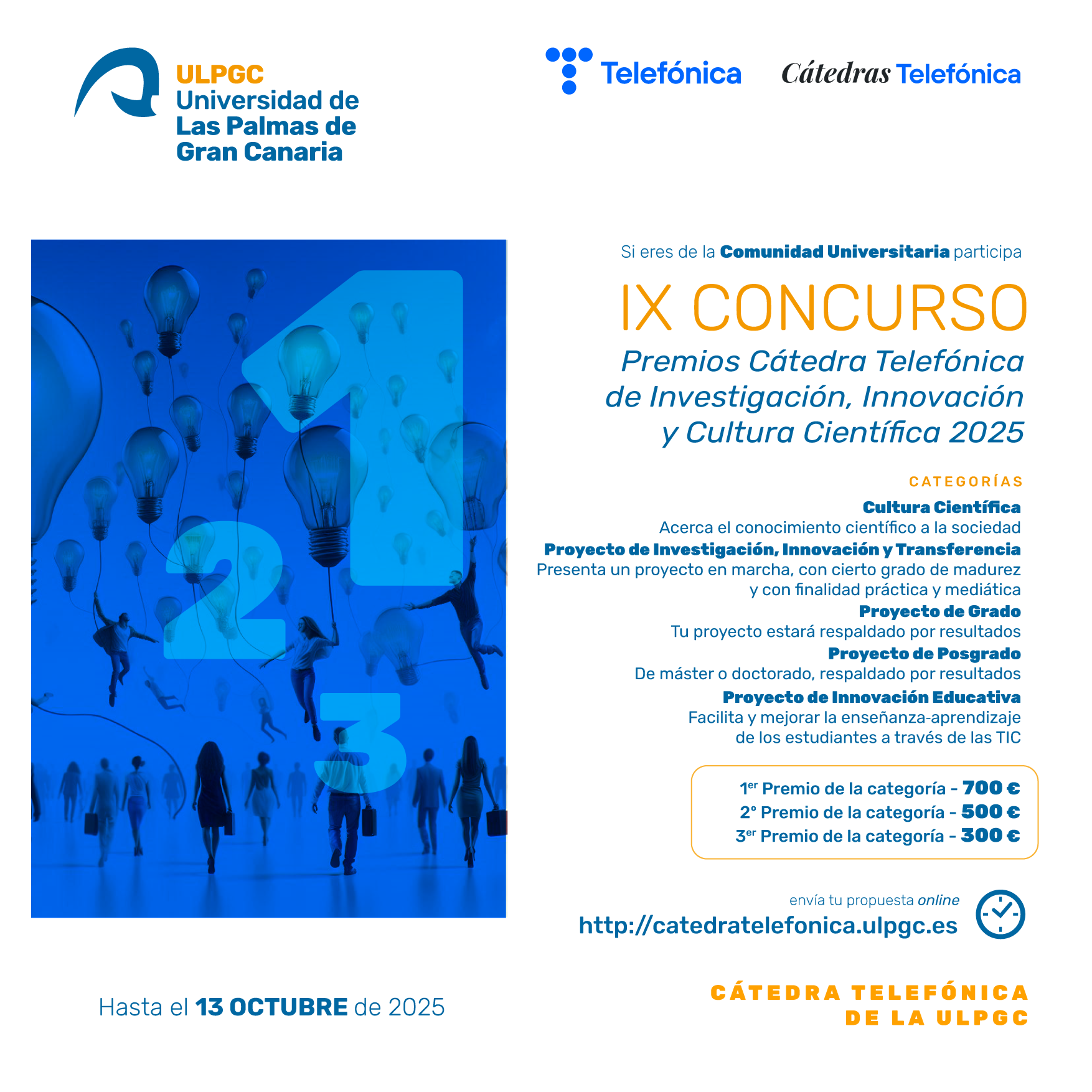 La Universidad de Las Palmas de Gran Canaria, a través del Vicerrectorado de Estudiantes y en colaboración con Telefónica Móviles España, S.A.U., convoca el IX Concurso Cátedra Telefónica ULPGC, en el marco del convenio específico suscrito entre ambas entidades. Esta iniciativa tiene como objetivo reconocer y fomentar el talento universitario en el ámbito de la investigación, la innovación y la cultura científica, con especial atención a propuestas que promuevan el uso responsable de la tecnología y respondan a necesidades sociales.
